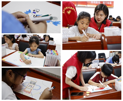 用筆觸描繪夢想,用色彩擁抱生活,在“我的夢想”創意繪畫環節,老師和志愿者們向孩子們講解了本次繪畫的主題及表現方式等內容,并進行了創作指導。稚嫩的小手握著五彩的畫筆,孩子們以飽滿的熱情投入繪畫,充分發揮各自的想象力、創造力,無拘無束地構思畫面、大膽創作,揮灑天馬行空,一條線、一點墨,處處閃耀著創作的靈感,真正把夢想留在了紙上,種在了心里。